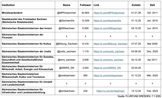 Die Tabelle (Stand der Erhebung: 1.1.2026, Korrektur: 7.1.2026) gibt einen schönen Überblick und umfasst die 10 sächsischen Ministerien sowie den Account des Ministerpräsidenten.