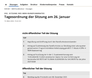 Die Sitzung hat schon begonnen, im Moment wird aber der nicht-öffentliche Teil verhandelt, Dabei stehen zwei wichtige Punkte auf der Tagesordnung: Die Zustimmung zum neuen Direktor Halle-Leipzig und die "Fortführung der Sendereihe Die Feste mit Florian Silbereisen für Das Erste. für die Jahre 2027/2028". Als Kandidaten für die Direktion hat Intendant Ralf Ludwig Boris Lochthofen ausgewählt (vgl. FLURFUNK vom 8.1.2026) - allgemein wird erwartet, dass seine Wahl durchgeht.